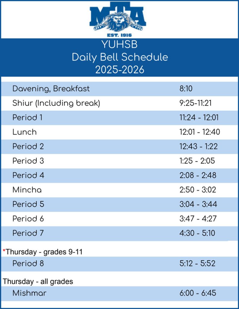 Our day is divided between Limudei Kodesh and Limudei Chol, or General Studies. The Limmudei Kodesh program, which runs either until 12:20 pm or until 2:00 pm depending upon the program, is divided into three parts. The majority of the morning is spent in the intense and in-depth (be-iyyun) study of Gemara with time devoted to the study of halachah and hashkafah, at the discretion of the Rebbe. The second component of the morning program is a 45 minute shiur devoted to the study of Tanakh, and the third component, applicable to our advanced track Shiurim, is comprised of basic general Gemara study with an emphasis on breadth over depth (bekius), which in some cases takes place in the Yeshiva University Beis Medrash under the guidance of RIETS students.